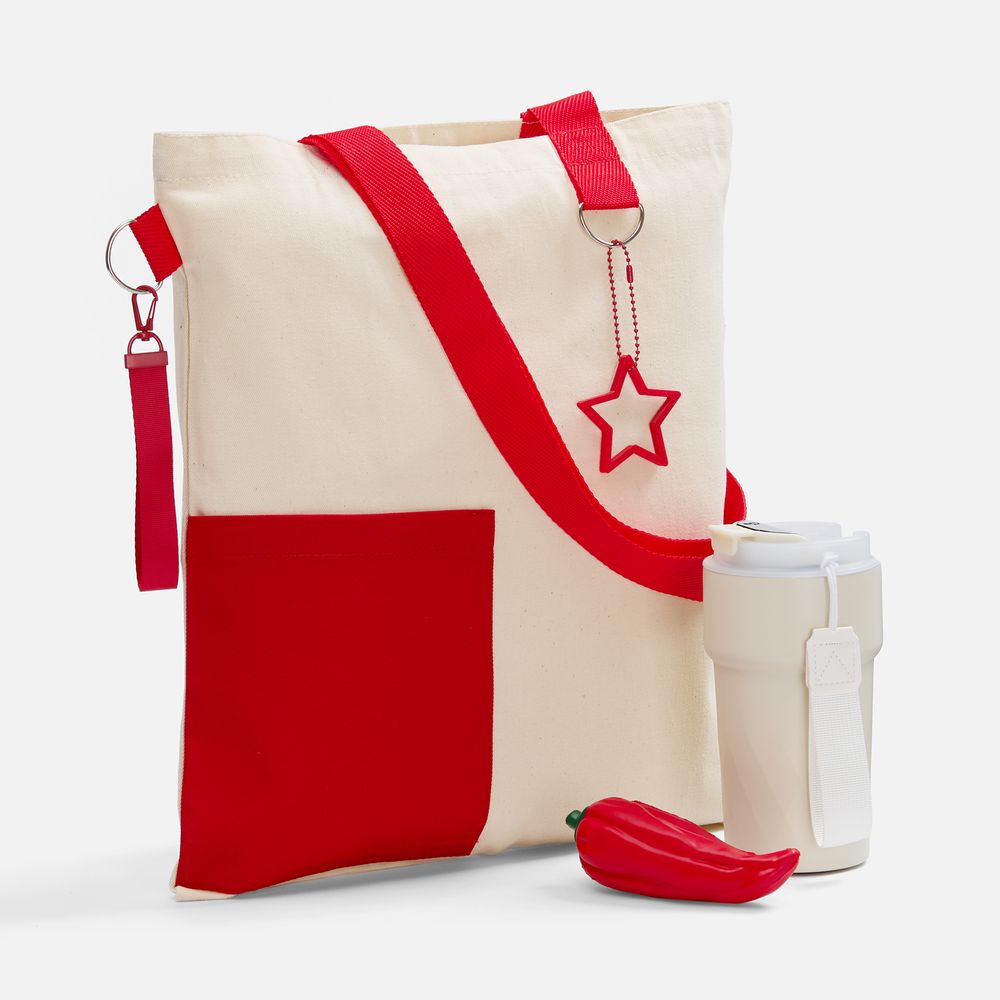 - термостакан - металл, пластик; шопер - хлопок 100%, плотность 240 г/м²; саржа; сквиши-антистресс - полиуретан; подвеска - пластик; ремувка - полиэстер 100%, металл; цепочка - металл
