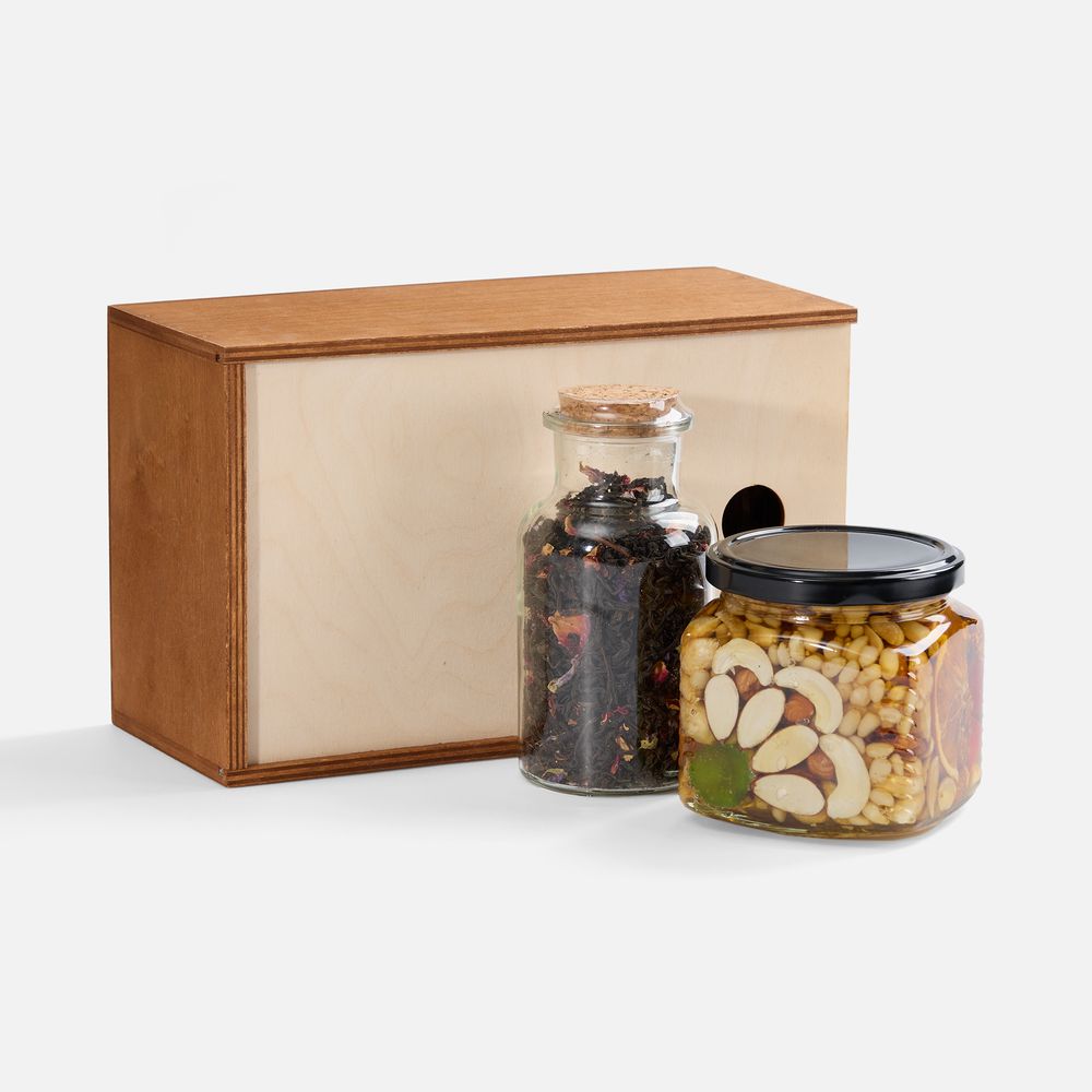 - мед - стекло; мешочек - полиэстер 100%; коробка - жесть