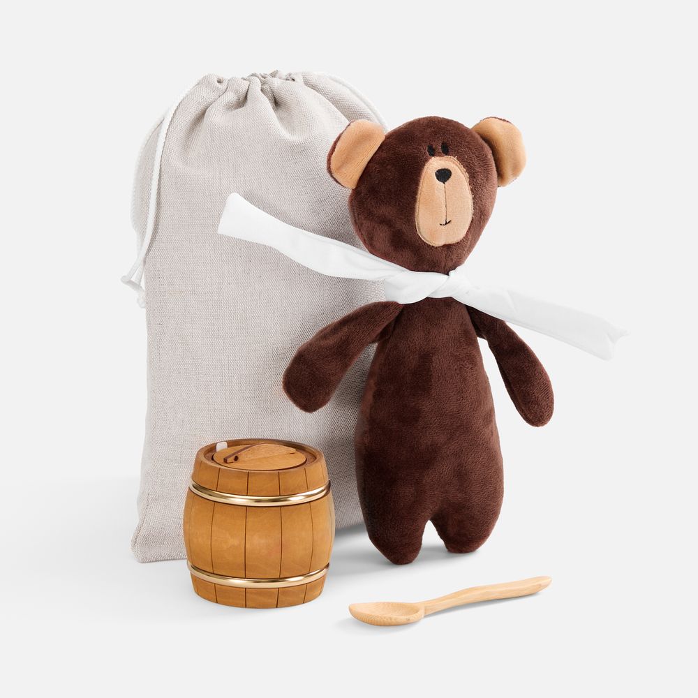 - шарф - акрил 100%; игрушка - велюр; набивка, шарфик - полиэстер 100%; баночки для меда - стекло; коробка - переплетный картон, бумага Majestic