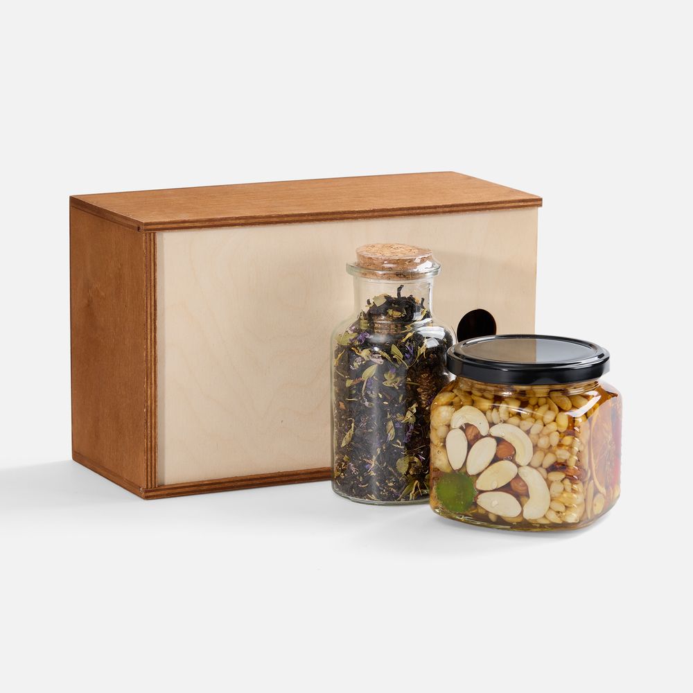 - чай - стекло, пробка; ящик, наполнитель - дерево; арахис, вишня, миндаль - полиэтилен