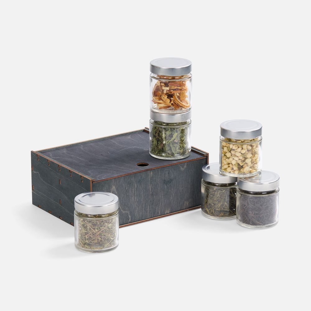 - дерево; бутылка - боросиликатное стекло, чехол - неопрен; ситечко - нержавеющая сталь; крышка - бамбук, пластик; подставка - бамбук; игрушка-антистресс - дерево; коробка - микрогофрокартон