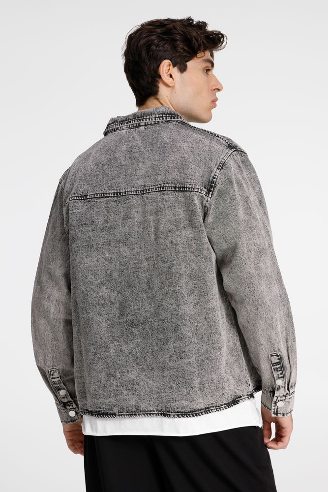 Джинсовая куртка-рубашка унисекс на кнопках прямого силуэта.