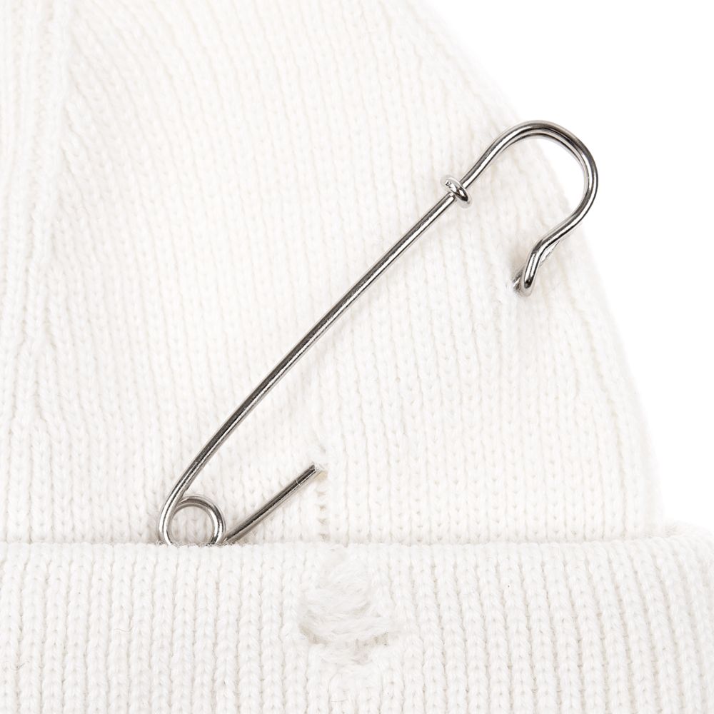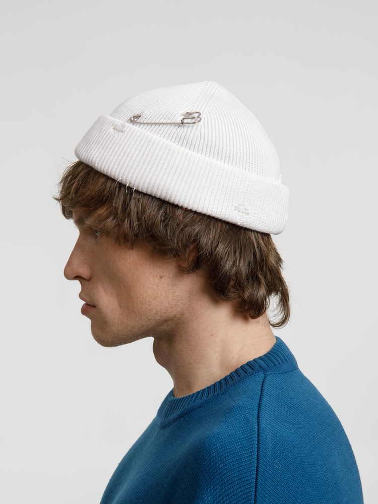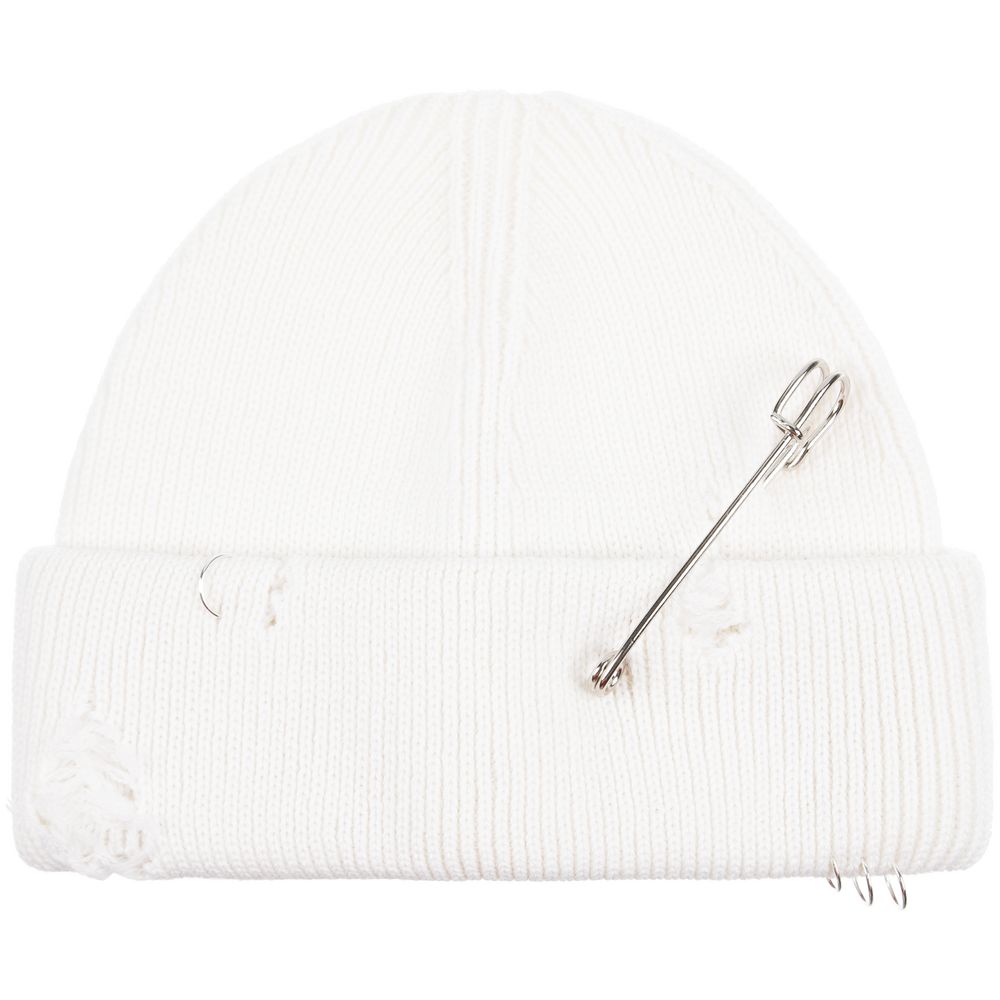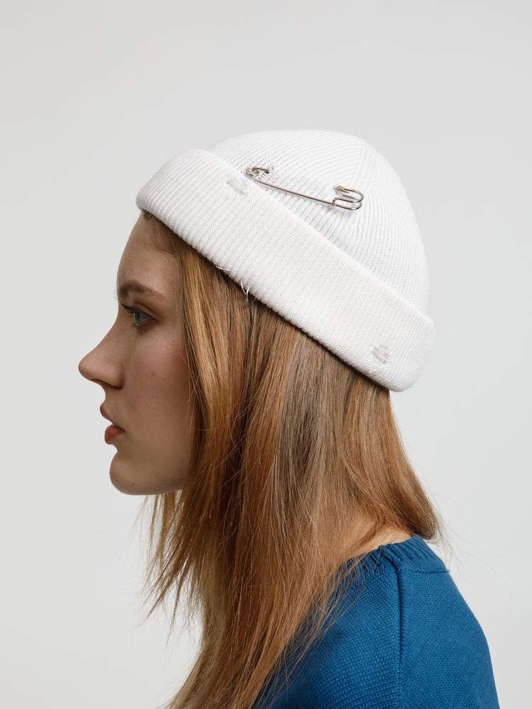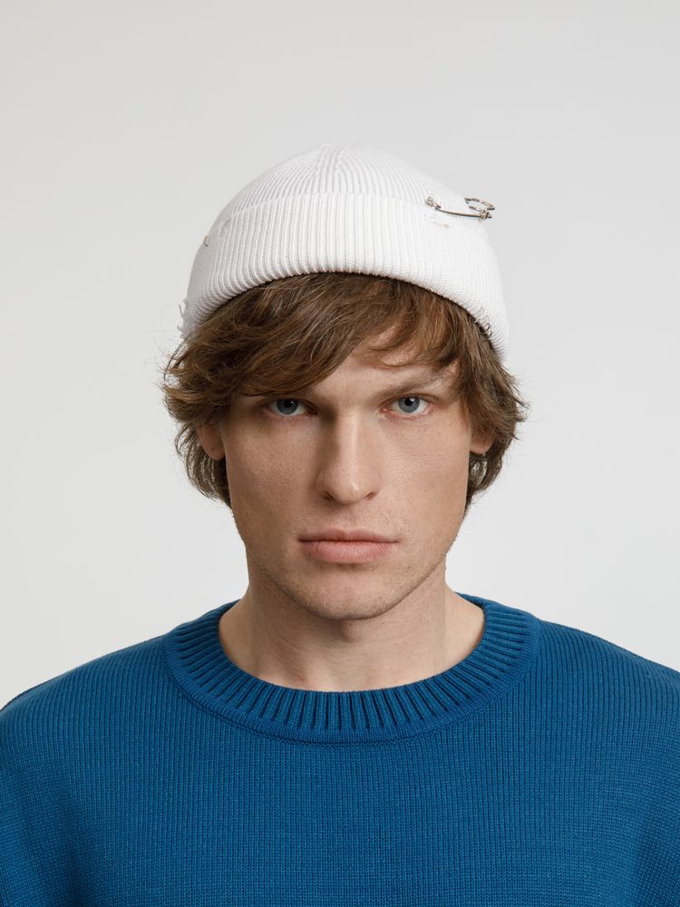 Однослойная шапка бини с рваным отворотом и металлическими аксессуарами для дерзких образов в любом возрасте. Яркий и запоминающийся акцент в стиле гранж.