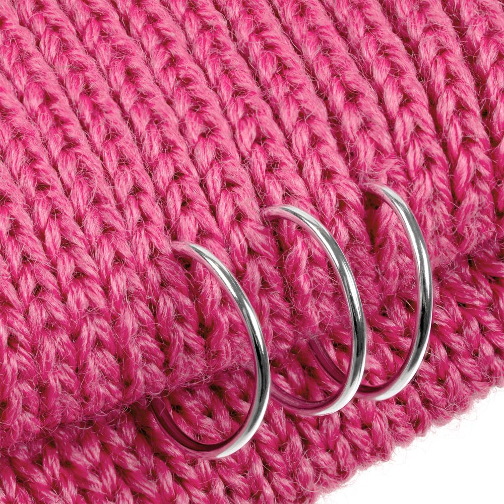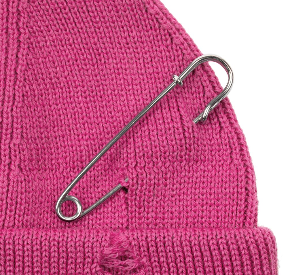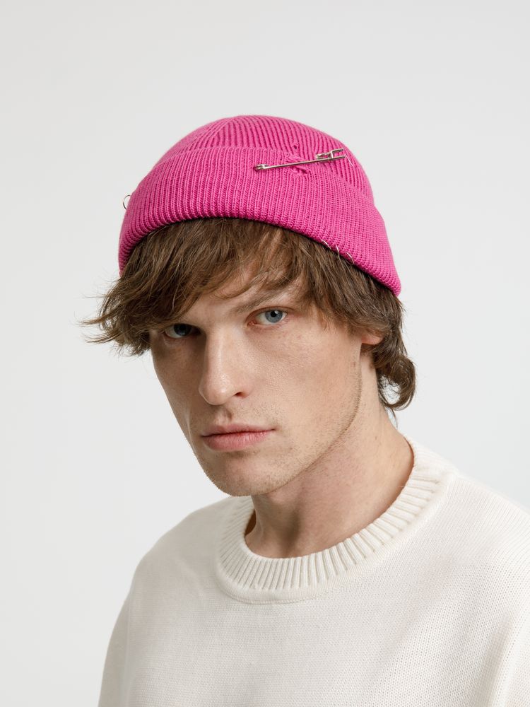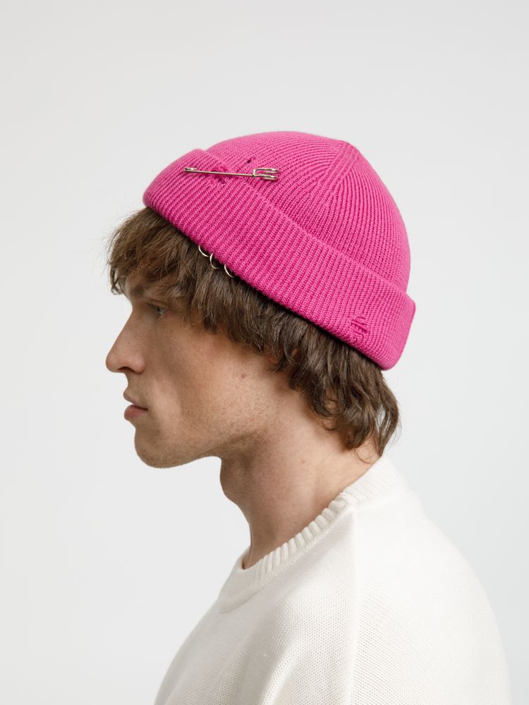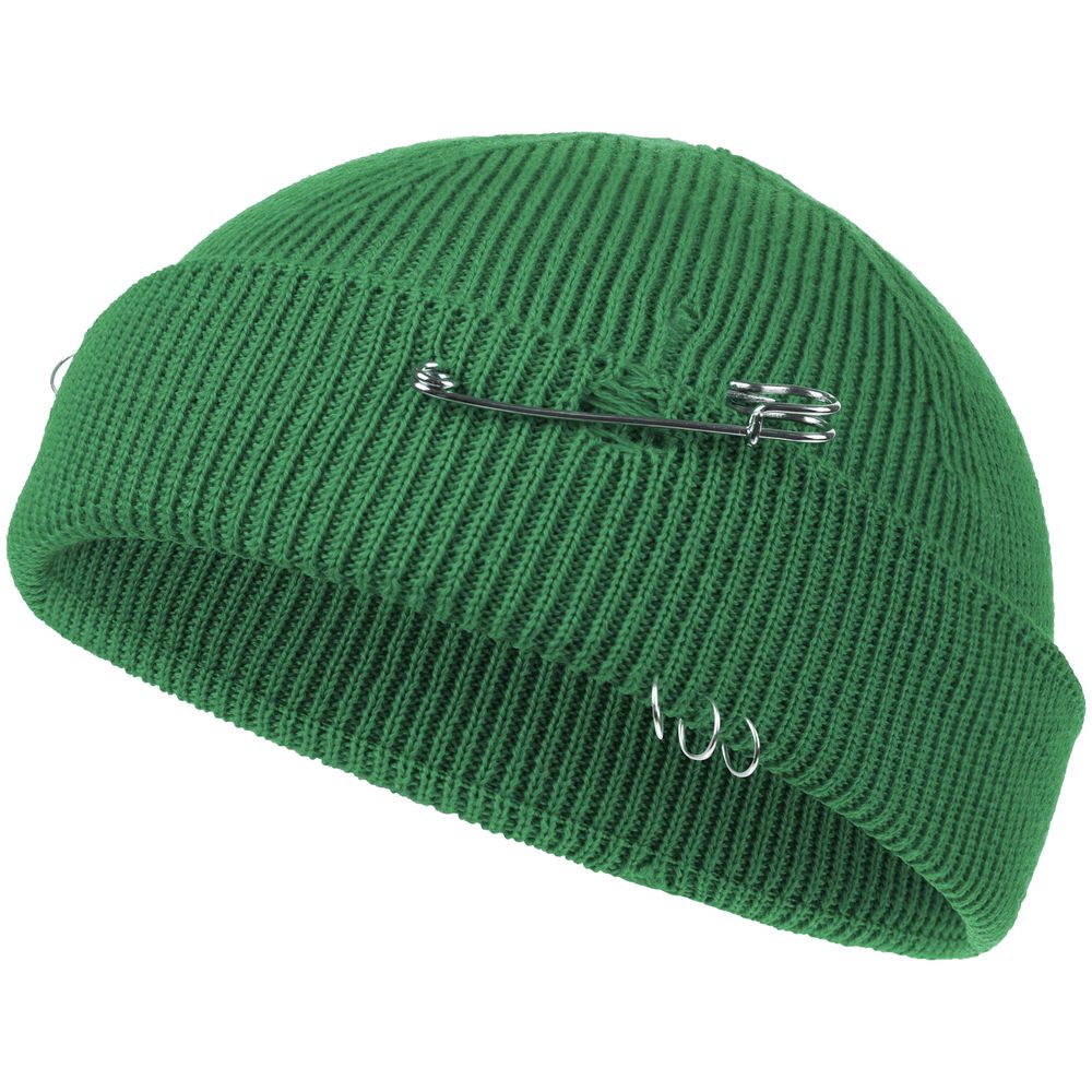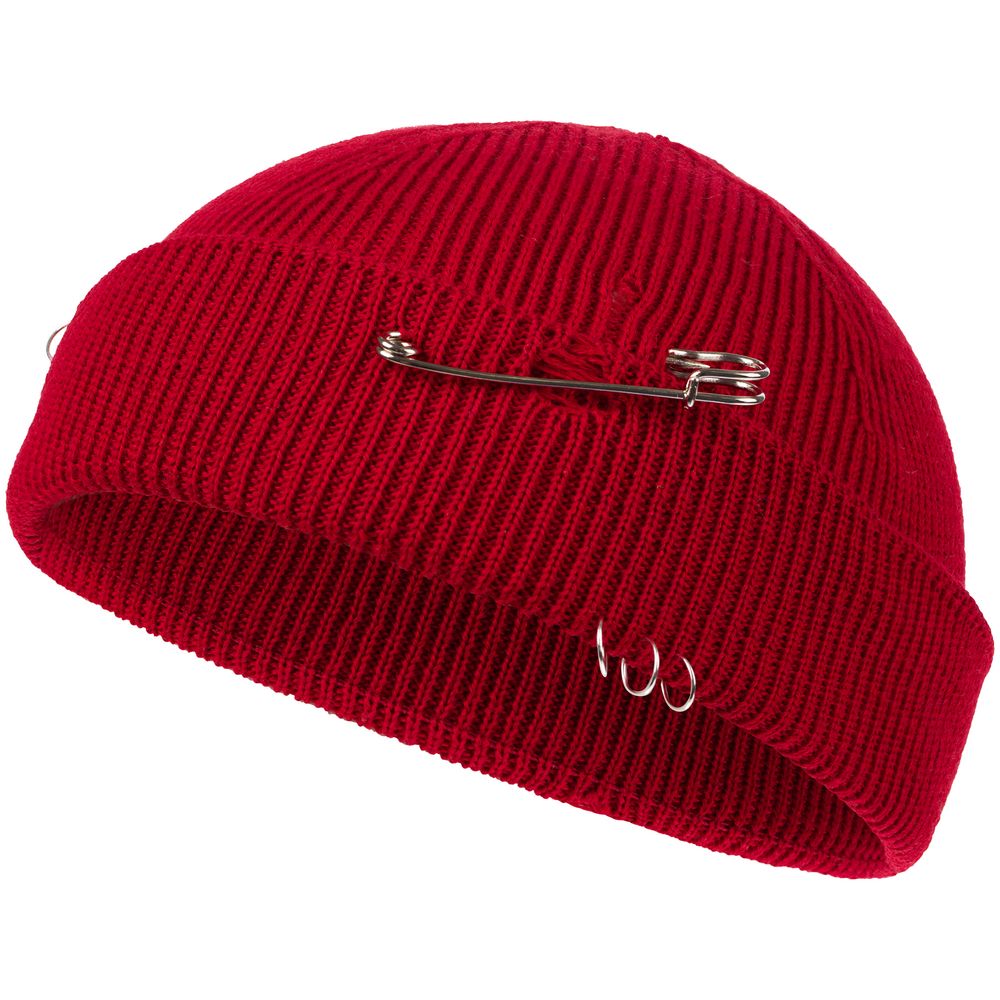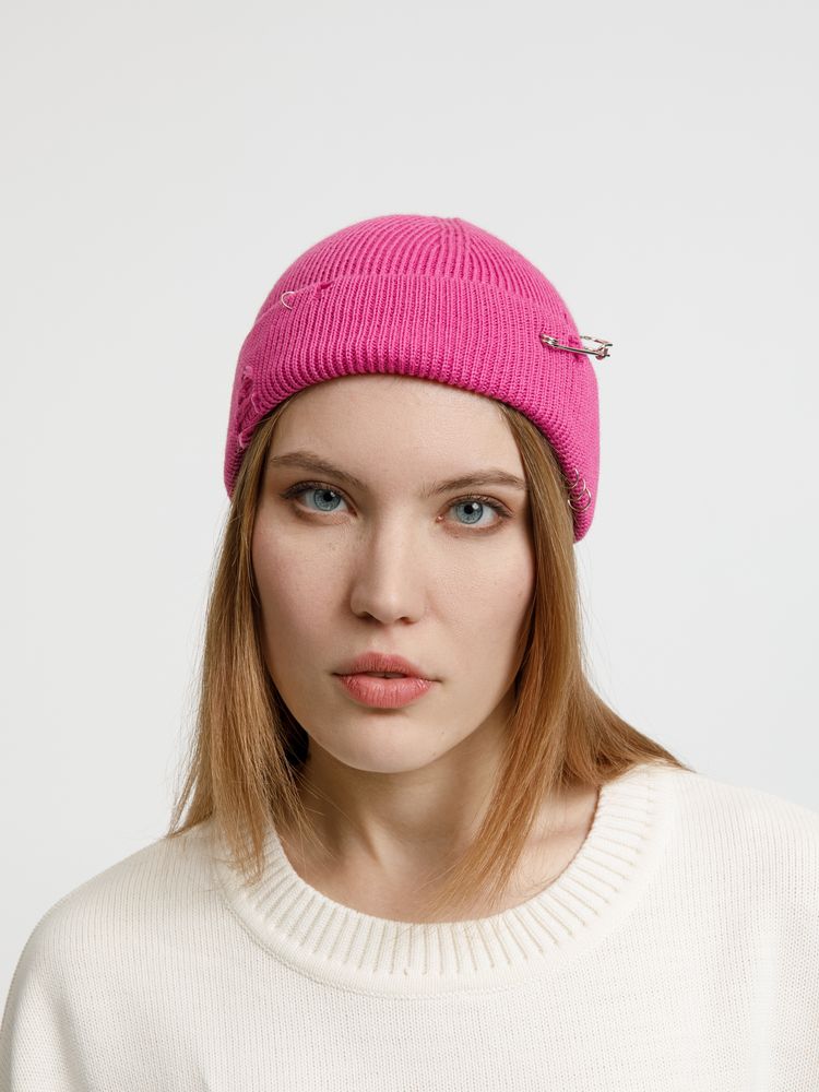Однослойная шапка бини с рваным отворотом и металлическими аксессуарами для дерзких образов в любом возрасте. Яркий и запоминающийся акцент в стиле гранж.
