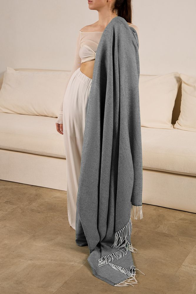 Классический рисунок «елочка» не слишком привлекает внимание, но в то же время добавляет изюминки. Смешанный состав пряжи продлевает срок службы и существенно облегчает уход за пледом.