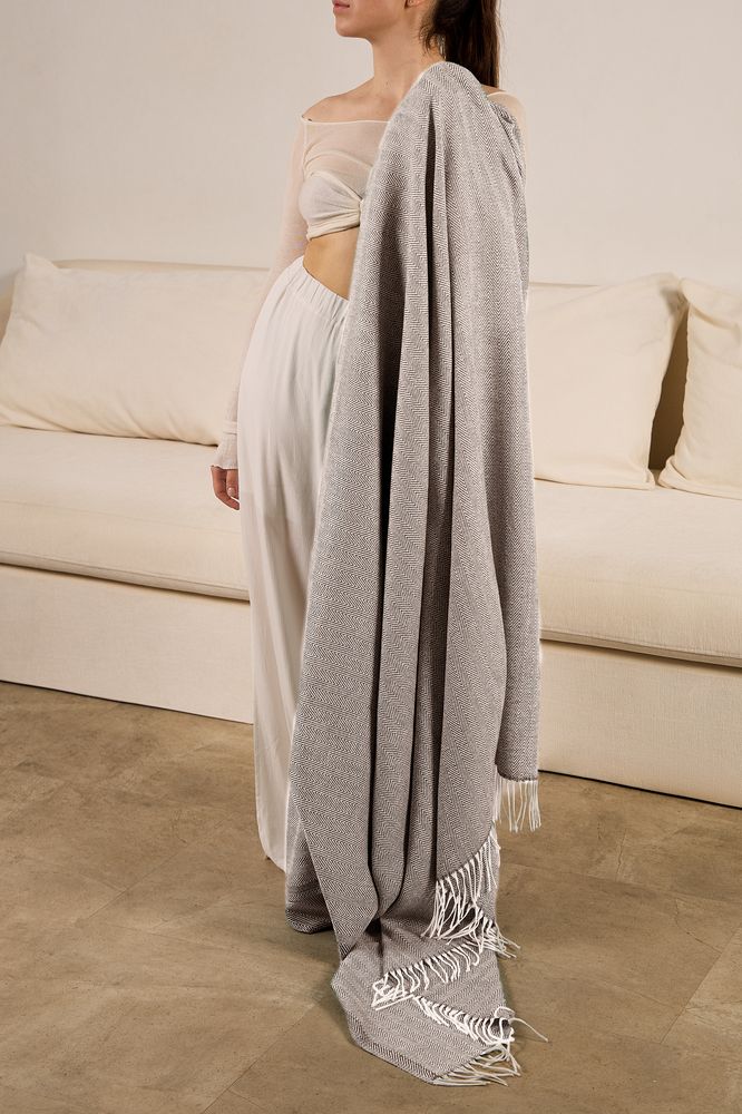 Классический рисунок «елочка» не слишком привлекает внимание, но в то же время добавляет изюминки. Смешанный состав пряжи продлевает срок службы и существенно облегчает уход за пледом.