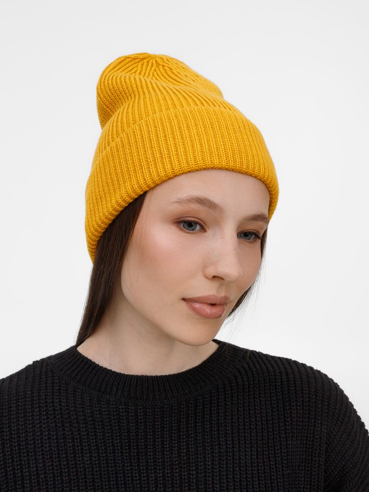 Удлиненный силуэт шапки Nobilis Mono из мягкой полушерстяной пряжи с широким отворотом создает стильный современный образ, а фактурная вязка добавляет объем и выразительность.
