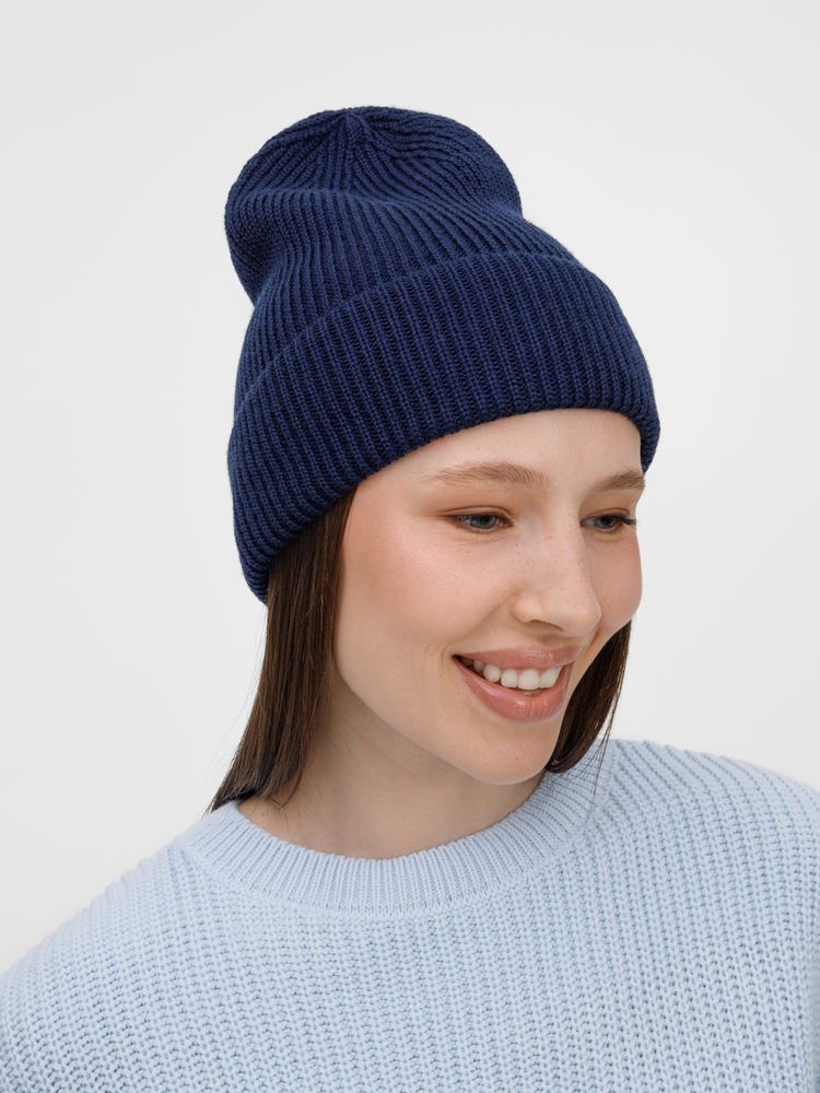 Удлиненный силуэт шапки Nobilis Mono из мягкой полушерстяной пряжи с широким отворотом создает стильный современный образ, а фактурная вязка добавляет объем и выразительность.