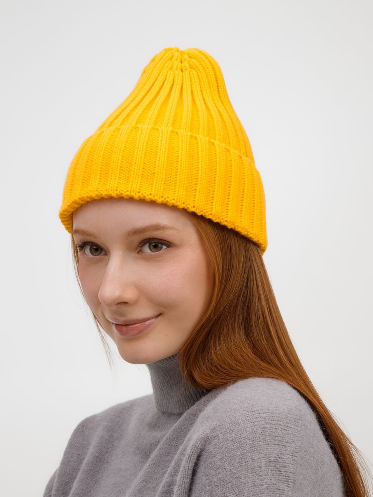 Однослойная шапка рельефной вязки с отворотом.