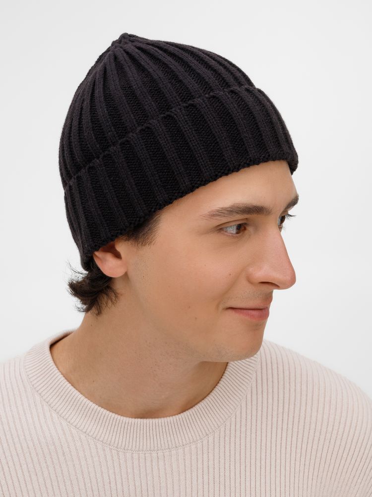 Однослойная шапка рельефной вязки с отворотом.